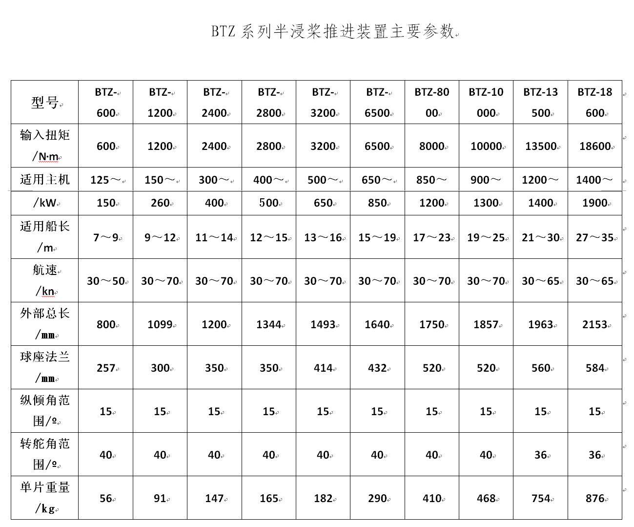BTZ系列半浸桨推进装置由半浸式螺旋桨及其驱动装置两大部分组成。依靠专业的研究团队和强大的试验设施,七0二所建立出比较完整成熟的4/5/6叶半浸桨系列图谱;在此研究基础上,七0二所通过产学研一体成果转化,成功开发出功率范围100kW-2000kW(扭矩范围600Nm-18600Nm)、使用上述半浸桨叶共计10个型号的BTZ系列半浸桨推进装置。该装置产品因技术水平高,使用效果好,得到用户的一致好评,已成功应用于各类军用船、公务船、旅游船和水文船等。