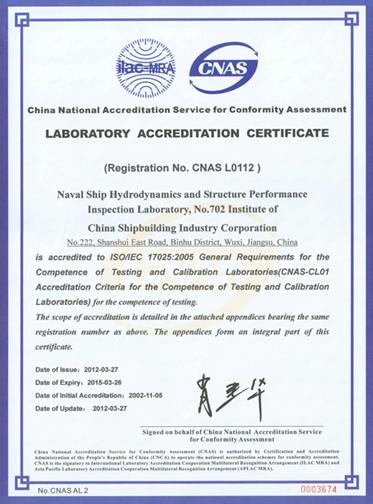 我所舰船流体与结构性能检测实验室的基础是舰船流体力学、结构性能等有关试验室。建所60多年来,我所已成为从事舰船、海洋工程等水动力性能、结构性能和安静性能试验检测的专业研究基地。拥有包括舰船快速性、耐波性、操纵性、水动力噪声等研究、试验所需的水池、风洞、水筒,从事实船性能检测的实船性能试验室,以及进行结构性能试验研究的配套完整的试验室群体和从事检测所需的设备和测试仪表,其整体规模和综合研究能力位居世界第三位。舰船流体与结构性能检测实验室二○○二年获得中国实验室国家认可委员会的认可,取得了国际互认的实验室认可证书(证书号:CNASL0112)。同时,舰船流体与结构性能检测实验室和已通过实验室认可与计量认证的中国船舶工业舰船总体性能试验检测中心(证书编号:2007000730W)、中国船舶工业金属结构试验检测中心(证书编号:2007000462W)为同一实体和同一套管理机构。