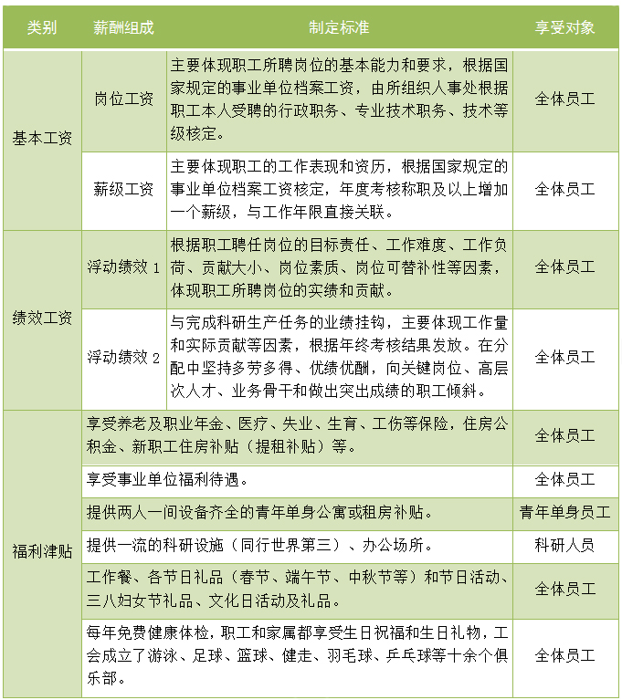• 绩效激励:本所具有规范的绩效管理系统,通过员工科研生产、专项任务等业绩的工作量、贡献情况目标责任、工作难度、工作负荷、贡献大小、岗位素质、岗位可替补性等因素综合核定。