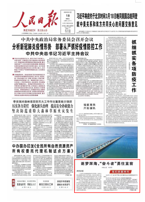 3月18日人民日报头版新专栏——“我们的新时代”刊发文章《逐梦深海,“奋斗者”勇往直前》文中描述了对中国船舶...