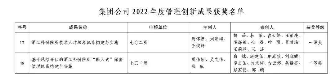 近日,中国船舶集团正式公布2022年度管理创新成果获奖名单,七〇二所报送的两项成果《军工科研院所技术人才培养体系构建与实施》和《基于风险评估的军工科研院所“融入式&rd...
